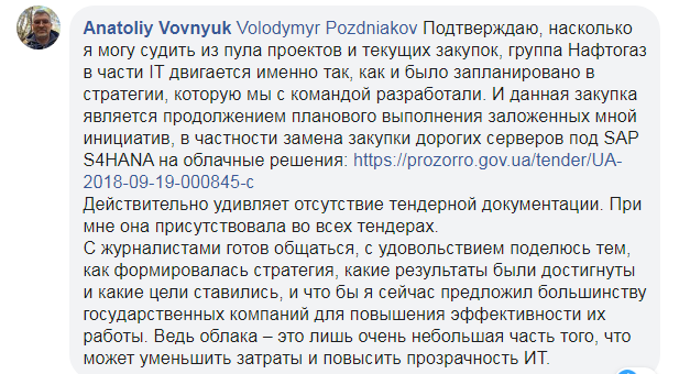 "...Данная закупка является продолжением планового выполнения заложенных мной инициатив, в частности, замена закупки дорогих серверов под SAP S4HANA на облачные решения. Действительно удивляет отсутствие тендерной документации. При мне она присутствовала во всех тендерах", - оправдался Вовнюк.