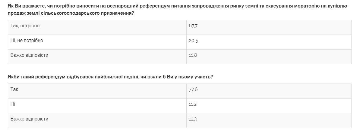 Большинство украинцев считает, что вопрос введения рынка земли и отмены моратория на куплю-продажу земли сельскохозяйственного назначения нужно выносить на всенародный референдум. Такого мнения придерживаются 67,7% респондентов, 20,5% опрошенных считают, что этот вопрос не следует выносить на референдум, остальные не определились с ответом.