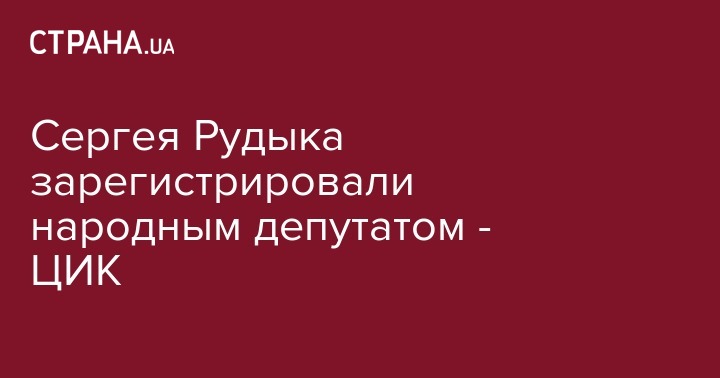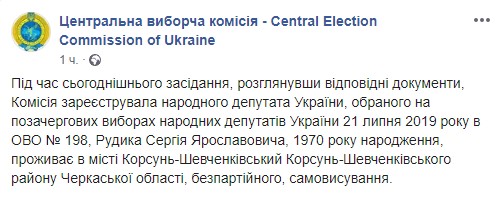"Во время сегодняшнего заседания, рассмотрев соответствующие документы, Комиссия зарегистрировала народного депутата Украины, избранного на внеочередных выборах народных депутатов Украины 21 июля 2019 года в ОИО № 198, Рудыка Сергей Ярославович, 1970 года рождения, проживает в городе Корсунь-Шевченковский Корсунь-Шевченковского района Черкасской области, беспартийного, самовыдвижение", - говорится в сообщении.