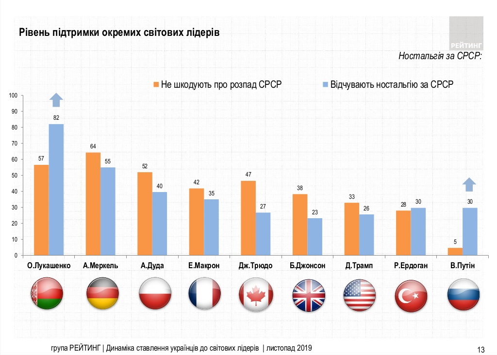 Те, кто жалеют о крахе Советского Союза, ориентируются на Лукашенко (82%), Ангелу Меркель (55%), Анджея Дуду (40%). Путин с Эрдоганом делят по 30% симпатий.