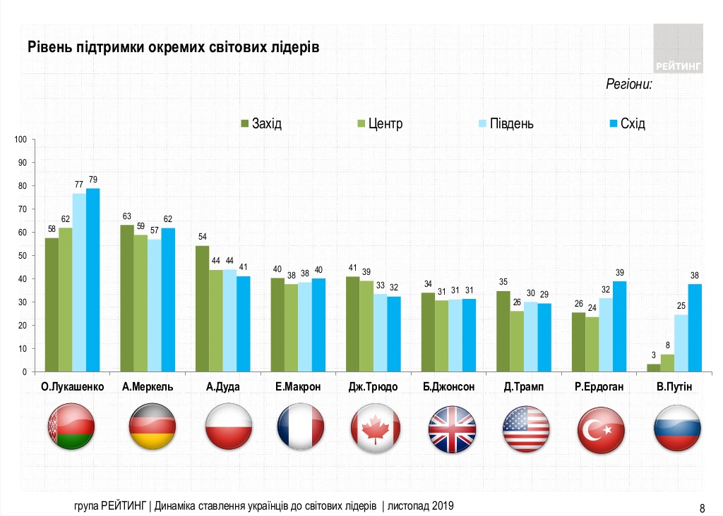 Среди наиболее обеспеченных украинцев симпатии в первой тройке распределились между Ангелой Меркель, Алксандром Лукашенко и Анджеем Дудой. Четвертое место с результатом выше 50% занимает канадский премьер Джастин Трюдо.