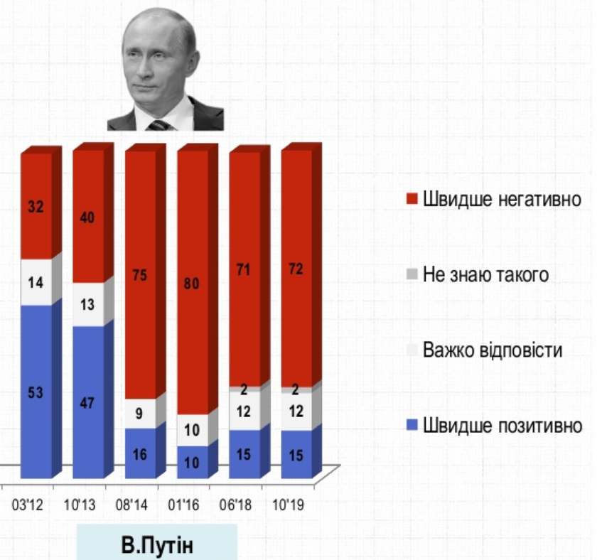 Сейчас он вернулся практически к показателям 2014 года - тогда популярность российского президента в Украине составляла 16%. Сейчас она 15%.