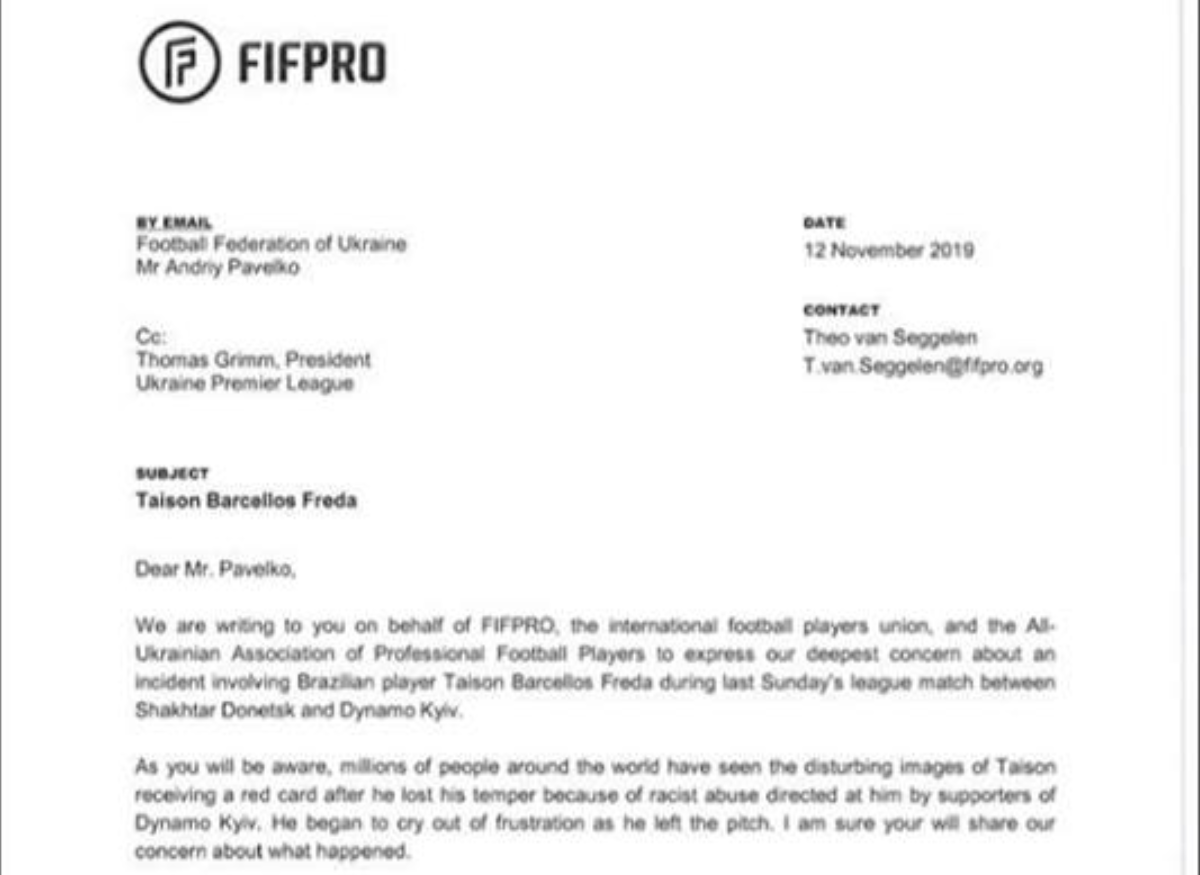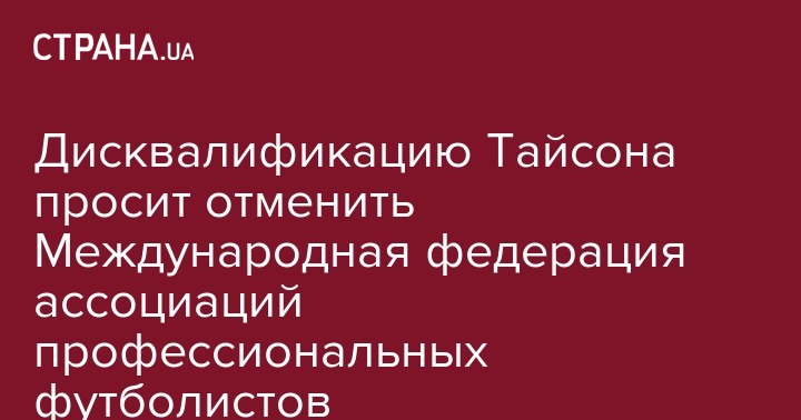 Их Международной федерации ассоциаций профессиональных футболистов (FIFPro) обратились в УАФ (экс-ФФУ) с просьбой отменить дисквалификацию полузащитника "горняков" Тайсона, наложенную из-за красной карточки в игре с "Динамо". Об этом FIFPro сообщила в Twitter.