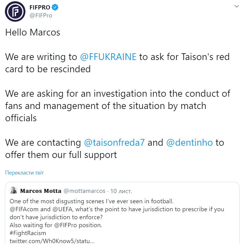 "Мы просим УАФ отменить красную карточку Тайсона. Также мы просим расследовать факт поведения болельщиков и того, как контролировали ситуацию официальные лица. Мы находимся на контакте с Тайсоном и Дентиньо, чтобы предоставить им полную поддержку с нашей стороны", – говорится в сообщении в ответ на пост футбольного юриста Маркоса Мотто о том, что он стал свидетелем одной из самых отвратительных сцен в футболе.