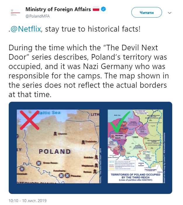 Матеуша Моравецкого возмутило, что на карте в сериале показали лагеря смерти, расположенные в пределах современных польских границ. По мнению чиновника, это является привлечением Польши к ложной ответственности, поскольку во время Второй мировой войны страну оккупировала Германия. Она вторглась в Польшу в 1939 году, что ознаменовало начало войны.