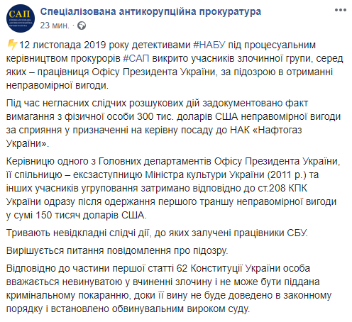 Светлану Кондзелю подозревают в коррупции и взяточничестве. В САП сообщили, что во время негласных следственных действий был задокументирован факт вымогательства. С физического лица требовали 300 тыс. долларов за назначение на пост заместителя председателя правления НАК "Нафтогаз Украины".