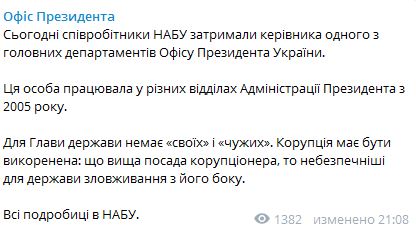 "Этот человек работал в различных отделах администрации президента с 2005 года. Для главы государства нет "своих" и "чужих". Коррупция должна быть искоренена: чем выше пост коррупционера, тем опаснее для государства злоупотребления с его стороны", - сообщили там. В ОП также добавили, что все подробности об этом деле расскажут в НАБУ.