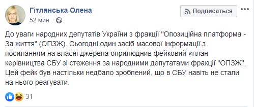 "Сегодня одно средство массовой информации со ссылкой на собственные источники обнародовал фейковый "план руководства СБУ" по слежению за народными депутатами фракции" ОПЗЖ", - написала Гитлянская.