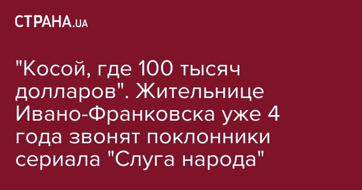 Уже четыре года неизвестные названивают жительнице Ивано-Франковска и спрашивают, где "Косой" и долг в 100 тысяч долларов. Как выяснилось, ее номер телефона фигурирует в одной из сцен последней серии первого сезона сериала "Слуга народа". Он записан в тетради "черной бухгалтерии", которую нашел "президент Голобородько". Оказалось, что такам же номером жительница Ивано-Франковска пользуется уже 15 лет.