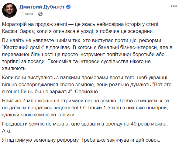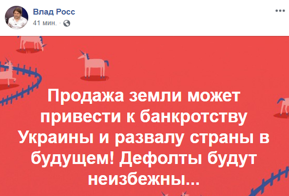 "Продажа земли может привести к банкротству Украины и развалу страны в будущем! Дефолты будут неизбежны", - написал он в Facebook.
