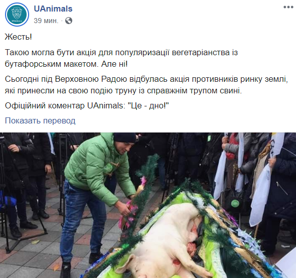 "Символические "похороны" свиньи олицетворяют будущее животноводства в Украине, которое обречено на гибель в случае внедрения "дикого" рынка земли", - утверждают авторы действа.