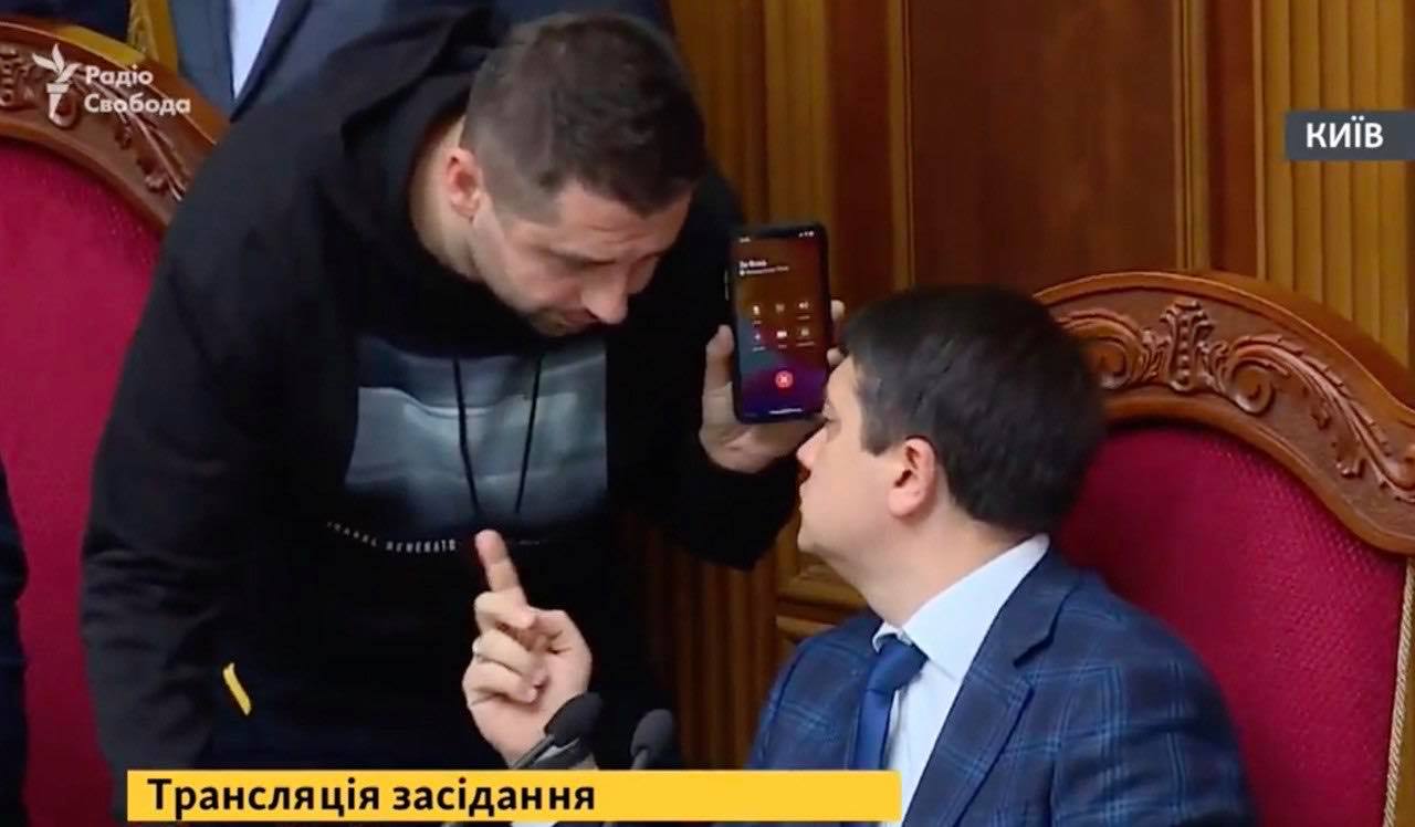 12:56 На трансляции Рады видно, как Арахамия подошел к Разумкову с телефоном, на котором видно, что на проводе некий "Зе Вова". То есть видимо звонит президент.