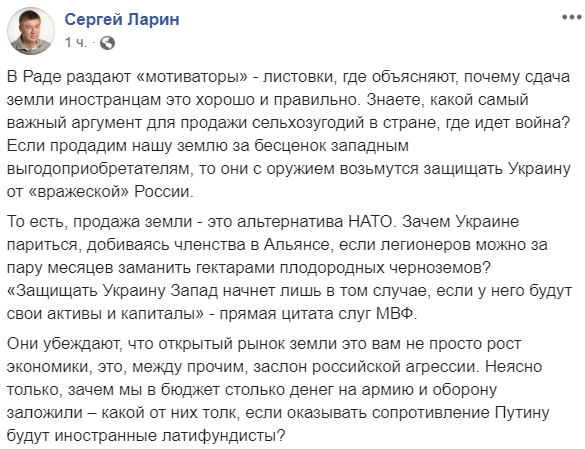 14:59 В Раде раздают листовки, где объясняют, почему сдача земли иностранцам это хорошо и правильно, пишет нардеп от "Платформы" Сергей Ларин.