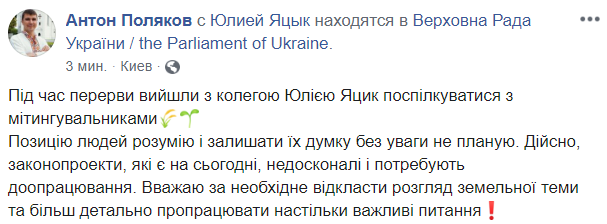 11:23 Пока в Раде перерыв, депутаты от "Слуги народа" Антон Поляков и Юлия Яцык выступили против принятия закона по земле и потребовали его отложить.