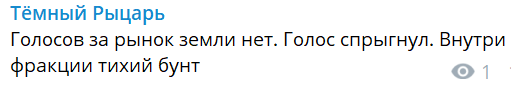 10:46 "Голосов за рынок земли нет. Голос спрыгнул. Внутри фракции тихий бунт", - пишет близкий к "Слуге народа" телеграм-канал "Темный рыцарь".