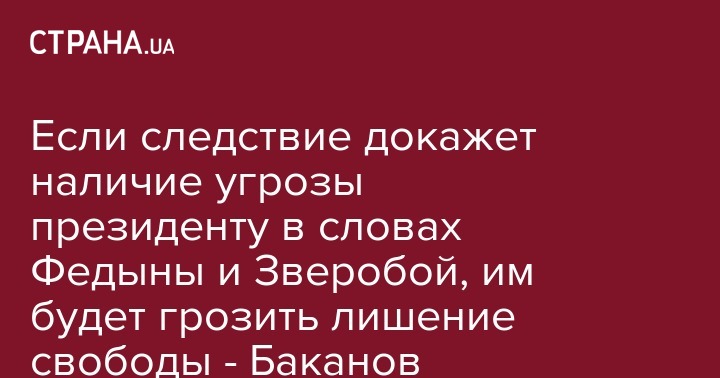 В случае подтверждения следствием наличия угрозы в высказываниях депутата от партии Европейская солидарность Софии Федыны и волонтера  Маруси Зверобой в адрес президента Владимира Зеленского, то им может грозить лишение свободы. Об этом заявил глава СБУ Иван Баканов, передает Главком