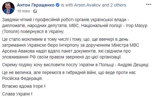 "Благодаря четкой и профессиональной работе органов украинской власти, дипломатов, нардепов, МВД, Нацполиции - Игоря Мазура вернули в Украину", - написал он.