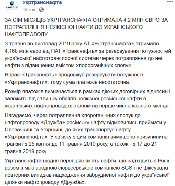 "С мая по ноябрь 2019 АО "Укртранснафта" получило 4,168 млн евро от ОАО "Транснефть" за резервирование мощностей украинской нефтетранспортной системы из-за попадания в нее нефти с повышенным содержанием хлорорганических соединений", - уточнили в пресс-службе.