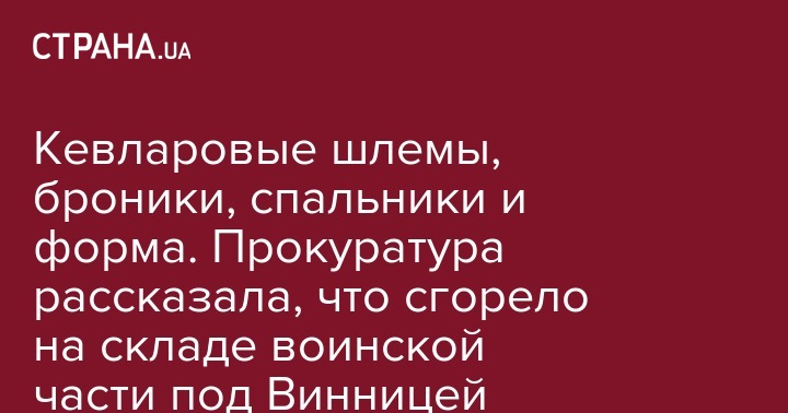 "В металлическом ангаре вещевого склада площадью 200 кв. м возник пожар. Огнем уничтожено имущество, хранившееся в здании: около 1100 кевларовых шлемов, 800 бронежилетов, 1500 спальных мешков, 100 полевых палаток, более 1000 единиц полевой формы, 1400 костюмов защиты от воды и прочее. Предварительная сумма ущерба - 10,5 млн грн", - говорится в сообщении.