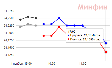 Вечером котировки следующие: покупка - 24,23 грн, продажа - 24,28 грн.