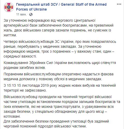 "По уточненной информации от дежурного Центральной артиллерийской базы обеспечения боеприпасами, к сожалению, двое военных саперов получили ранения несовместимых с жизнью", - сказано в сообщении Генштабе.