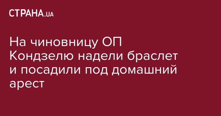 Главе одного из департаментов Офиса президента Украины Светлане Кондзеле назначили меру пресечения в виде круглосуточного домашнего ареста и назначили ношение электронного браслета. Об этом сообщили в пресс-службе Специализированной антикоррупционной прокуратуры Украины.