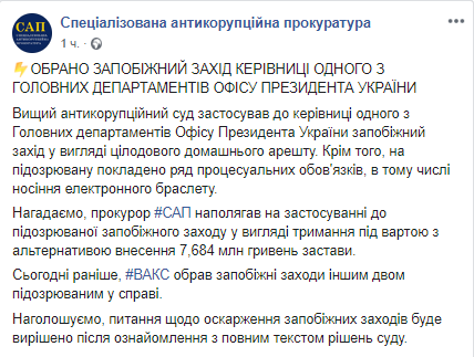 "Высший антикоррупционный суд применил к руководительнице одного из Главных департаментов Офиса Президента Украины меру пресечения в виде круглосуточного домашнего ареста. Кроме того, на подозреваемую возложен ряд процессуальных обязанностей, в том числе ношение электронного браслета", - говорится в сообщении.