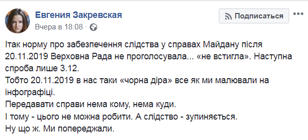 "То есть 20 ноября у нас  уже "черная дыра". Передавать дела некому, некуда , и поэтому... следствие останавливается", - написала Закревская.