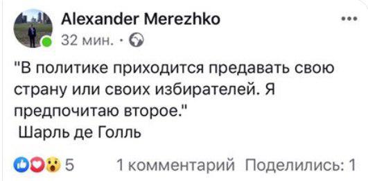 Народный депутат фракции "Слуги народа", председатель подкомитета Верховной Рады по гражданскому и административному законодательству и член постоянной делегации в ПАСЕ Алесандр Мережко процитировал слова Шарля де Голля о том, что лучше предавать - страну или избирателей. Цитатой политик поделился в своем Facebook.