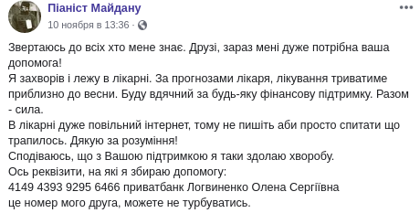 Он сообщил, что остальные подробности можно узнать у адвоката Елены Логвиненко - ответственной за материальную помощь Богдану, а также оставил в посте реквизиты карты на помощь.