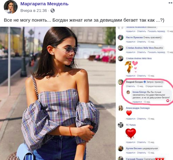 Глава Офиса президента Украины Андрей Богдан написал комментарий к посту с красивой фотографией киевлянки Маргариты Мендель в Facebook и вызвал бурную реакцию в сети.