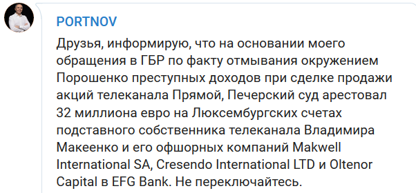 "Друзья, информирую, что на основании моего обращения в ГБР по факту отмывания окружением Порошенко преступных доходов при сделке продажи акций телеканала Прямой, Печерский суд арестовал 32 миллиона евро на Люксембургских счетах подставного собственника телеканала Владимира Макеенко и его офшорных компаний Makwell International SA, Cresendo International LTD и Oltenor Capital в EFG Bank. Не переключайтесь", - написал юрист.