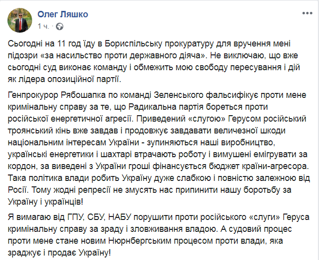 "Генпрокурор Рябошапка по команде Зеленского фальсифицирует против меня уголовное дело за то, что "Радикальная партия" борется против российской энергетической агрессии. Приведенный "слугой" Герусом российский троянский конь уже нанес и продолжает наносить огромный ущерб национальным интересам Украины: останавливаются наши производства, украинские энергетики и шахтеры теряют работу и вынуждены эмигрировать за границу, на выведенные из Украины деньги финансируется бюджет страны-агрессора", - написал Ляшко.