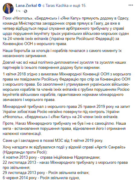 "1 апреля 2019 года, в соответствии с требованиями Международной Конвенции ООН по морскому праву, мы сообщили Российской Федерации о споре по Конвенции ООН по морскому праву. Потому что захват и удерживание украинских военно-морских кораблей и членов их экипажей являются грубым нарушением Россией иммунитетов военных кораблей, гарантированных нормами международного обычного и морского права. Международный трибунал по морскому праву 25 мая 2019 года на запрос Украины обязал Россию немедленно вернуть под контроль Украины "Бердянськ", "Нікополь" и "Яни Капу" и 24 членов их экипажей. Однако приказ Международного трибунала не был и не является самоцелью. Наша цель - установление нарушения права, восстановление его и получение надлежащей компенсации", - отметила Зеркаль.