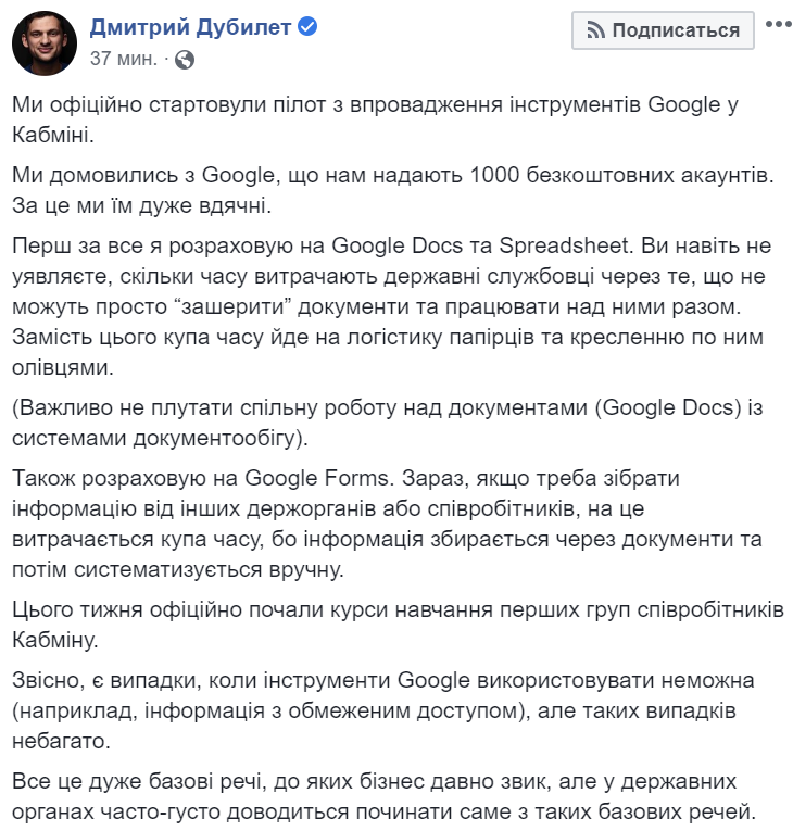 Власти Украины заключили договор с корпорацией Google по предоставлению 1000 бесплатных учетных записей (аккаунтов) для размещения на них государственных документов. Об этом говорится в понедельник, 18 ноября, на Facebook-странице министра Кабинета министров Дмитрия Дубилета.