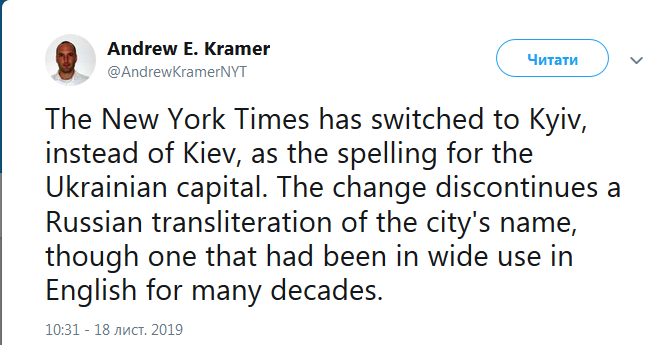"Это изменение прекращает русскую транслитерацию названия города, несмотря на то, что она широко использовалась в английском языке в течение многих десятилетий", - написал журналист.