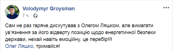 "Сам не раз горячо дискутировал с Олегом Ляшко, но требовать заключения за его откровенную позицию по энергетической безопасности государства, пусть даже эмоциональную, это перебор! Олег Ляшко, держись!" - написал бывший премьер.