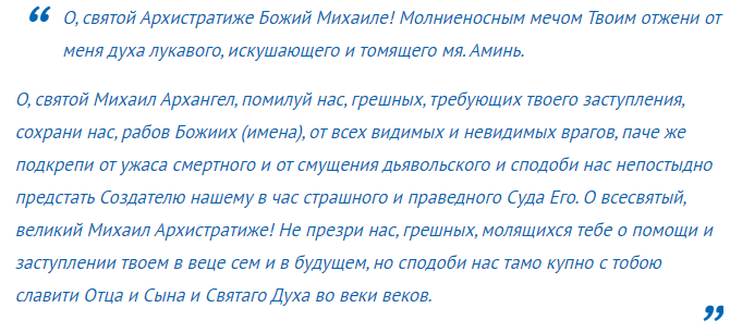 Церковные традиции: на архангела Михаила ходят в церковь, молятся о защите от всего лукавого, от дурных помыслов и злого окружения, примирении с врагами, а также об исцелении различных заболеваний.
