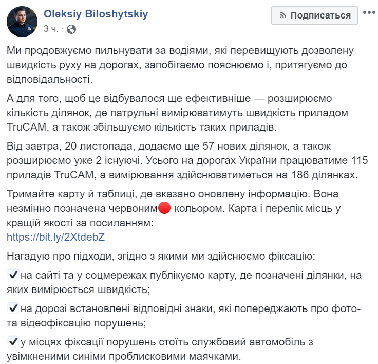"Расширяем количество участков, где патрульные измерять скорость прибором TruCAM, а также увеличиваем количество таких приборов ... 20 ноября добавляем еще 57 новых участков, а также расширяем уже 2 существующие", - говорится в опубликованном сообщении.