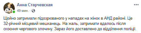 "Только что задержали подозреваемого в нападениях на женщин в АНД районе. Это 32-летний местный житель. К сожалению, задержать удалось после совершения очередного преступления. Сейчас он доставлен в отделение полиции", - написала в соцсети пресс-секретарь региональной Нацполиции Анна Старчевская.