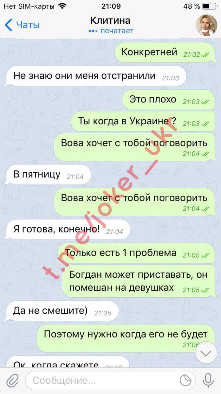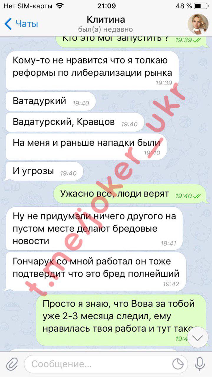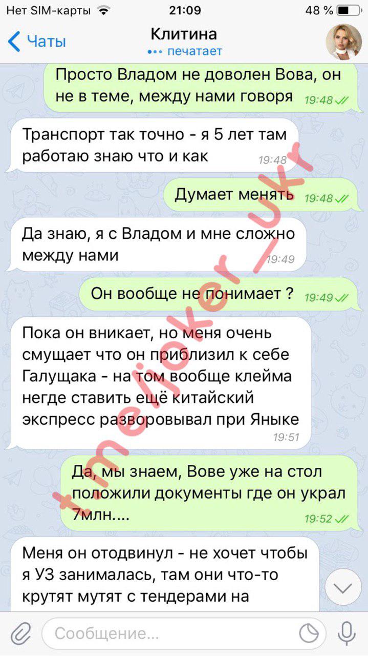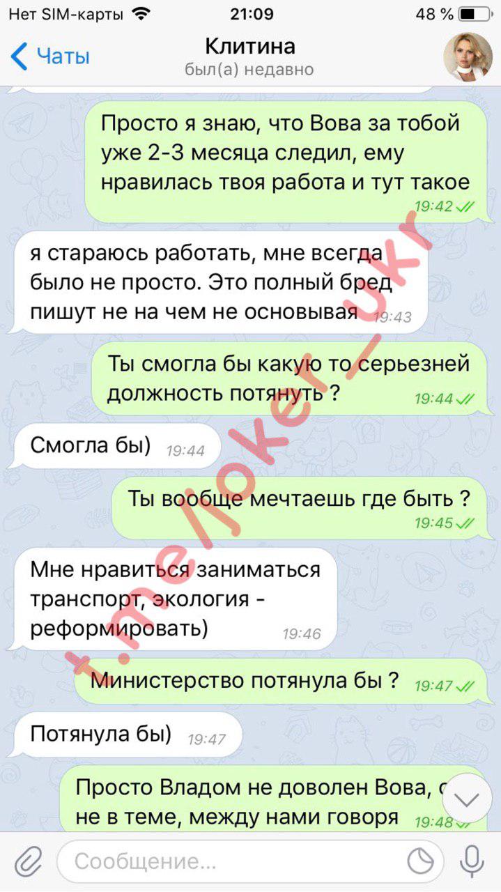 Кроме того, во время переписки Клитина дала понять, что хотела бы получить должность министра транспорта и инфраструктуры. На вопрос от Джокера, "потянула" бы она министерство, Клитина ответила "потянула бы".