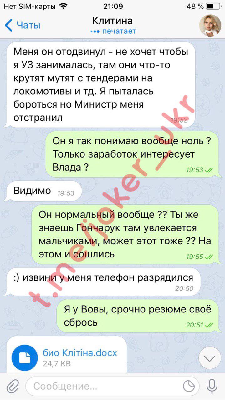Также Клитина негативно оценила деловые качества своего начальника - министра инфраструктуры Криклия, написала, что он принимает на работу коррупционеров, что-то мутит с тендерами на "Укрзализныце", а также о том, что в министерстве на ключевых должностях стоят люди Ахметова.