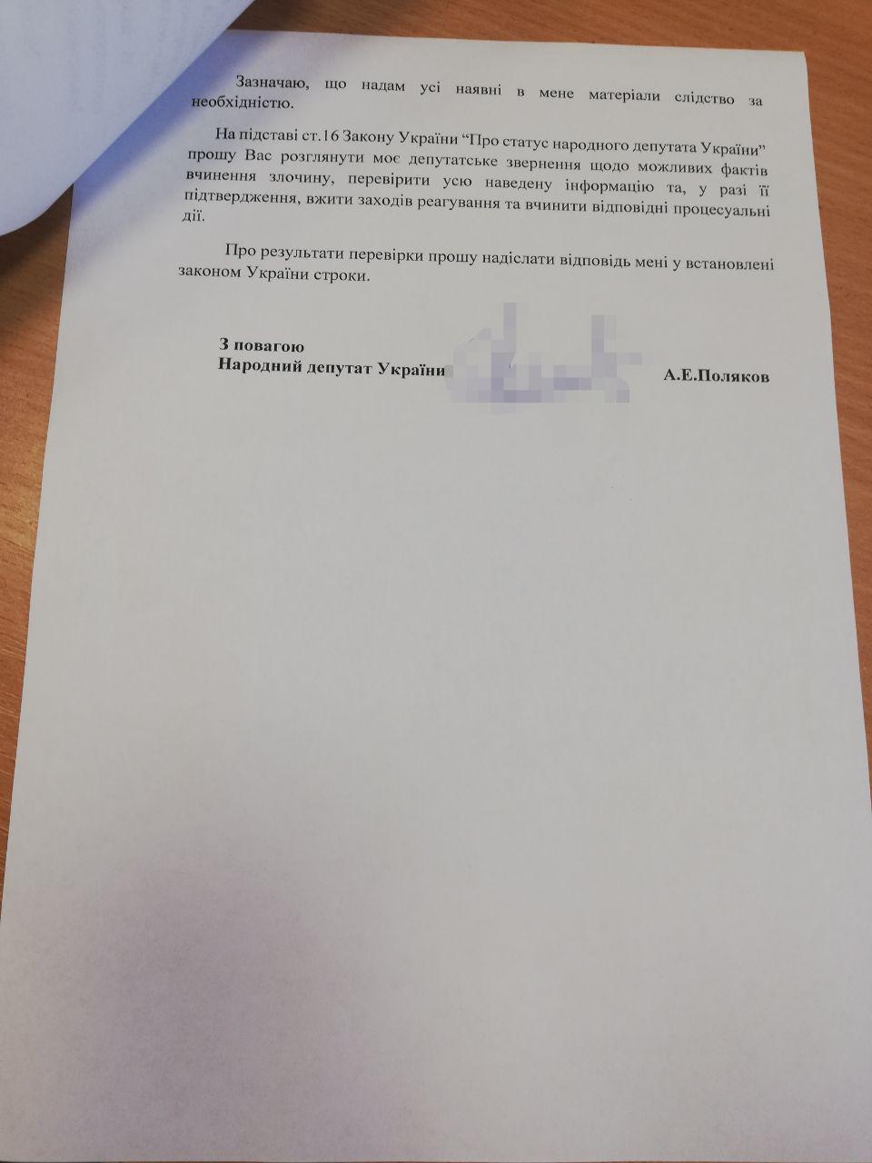 Народный депутат Антон Поляков обратился в ГБР и НАБУ с заявлением о необходимости проверить на предмет возможного совершения преступления некоторыми членами фракции "Слуга народа". Об этом сам Поляков сообщил "Стране" и показал соответствующие документы.