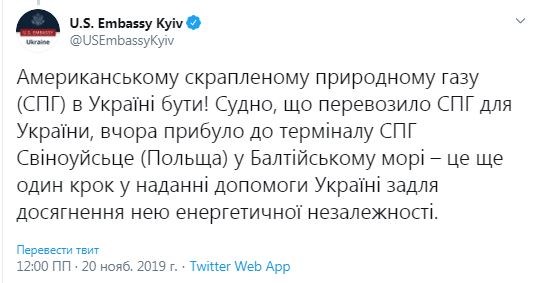 "Американскому сжиженному природному газу (СПГ) в Украине быть! Судно, которое перевозило СПГ для Украины, вчера прибыло в терминал СПГ Свиноуйсьце (Польша) в Балтийском море - это еще один шаг в предоставлении помощи Украине для достижения ею энергетической независимости", - сказано в сообщении посольства США в Украине.