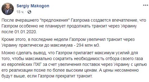 По его словам, после предложения "Газпрома" о продлении контракта на год, "создается впечатление, что Газпром особенно не планирует продолжать транзит через Украину после 01.01.2020".