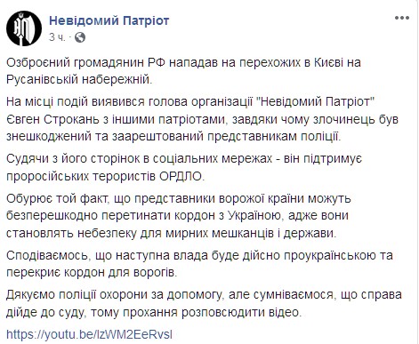 В Киеве на Русановской набережной задержали гражданина России, который угрожал прохожим при помощи пистолета Макарова. Информация опубликована на странице "Неизвестный патриот" в Facebook.