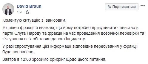"Как лидер фракции я считаю, что ему (Иванисову - Ред.) нужно приостановить членство в партии Слуга Народа и фракции на время проведения всесторонней проверки и выяснения всех обстоятельств данного инцидента. В случае опровержения этой информации соответствующее пребывание во фракции будет восстановлено", - написал Арахамия.