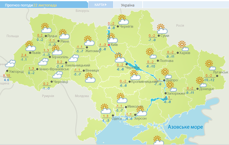 Также завтра на большей части Украины днем мороз -1...-3. Плюсовая температура в Одессе. Ужгороде, Черновцах, Львове. В Киеве днем -1...-3, ночью до -6...-8.
