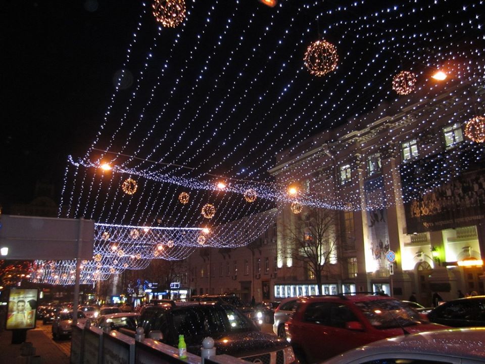 - ул. Грушевского — праздничная иллюминация на тросовых растяжках над проезжей частью и на опорах наружного освещения (новогодние мотивы, гирлянды);