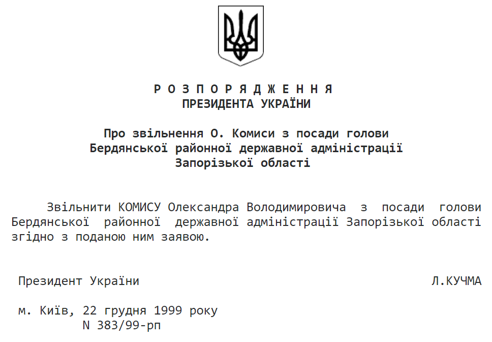 Этот чиновник возглавлял РГА до 1999 года, после чего был снят распоряжением президента Кучмы.
